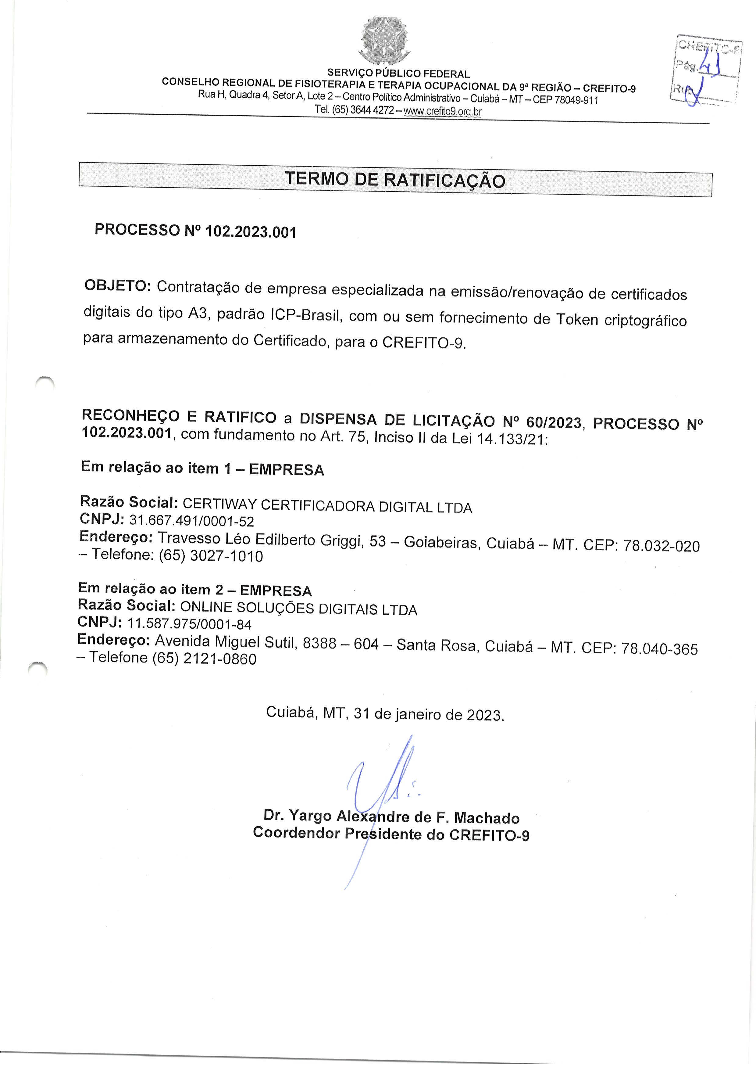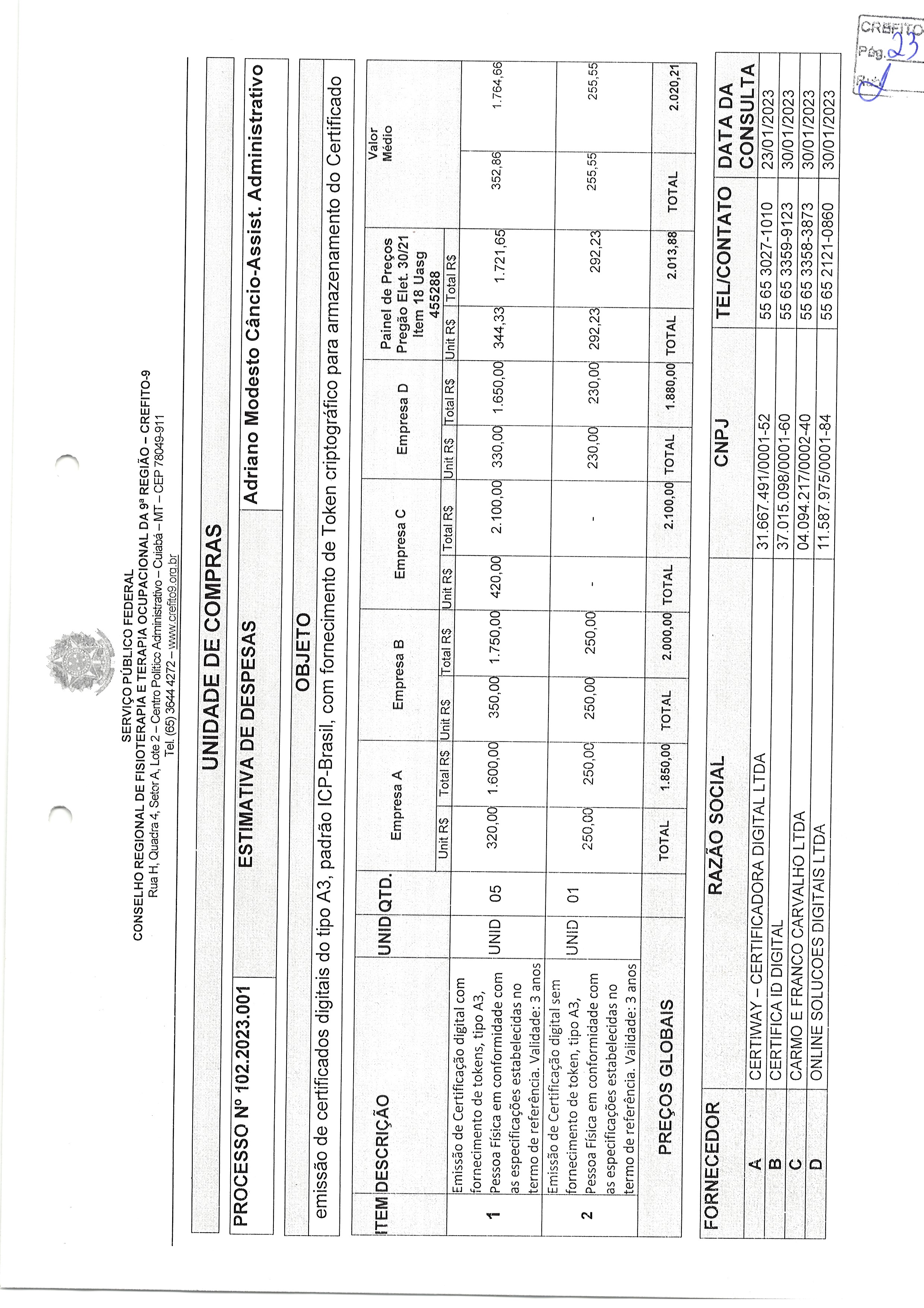 DISPENSA DE LICITAÇÃO Nº 01.2023 - DISPENSA DE LICITAÇÃO Nº 01.2023 - Escolha da melhor proposta para eventual prestação deserviços de emissão/renovação de certificados digitais do tipo A3, padrão ICP-Brasil, com ou sem fornecimento de Token criptográfico para armazenamento do Certificado, com validade por 3 anos, para o Conselho Regional de Fisioterapia eTerapia Ocupacional da Nona Região – CREFITO-9.