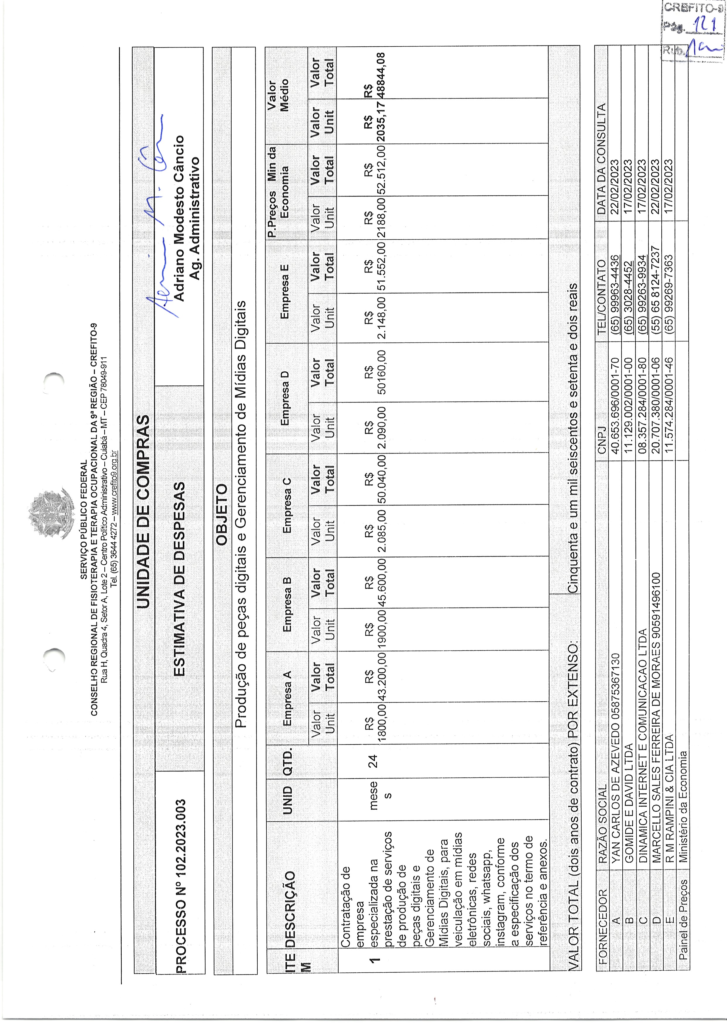 DISPENSA ELETRÔNICA Nº 03.2023 - DISPENSA ELETRÔNICA Nº 03.2023 - Contratação de empresa especializada na prestação de serviços de produção de peças digitais e Gerenciamento de Mídias Digitais, para veiculação em mídias eletrônicas, redes sociais, whatsapp, instagram, conforme a especificação dos serviços no termo de referência e anexos, nos termos da tabela abaixo, conforme condições e exigências estabelecidas neste instrumento.